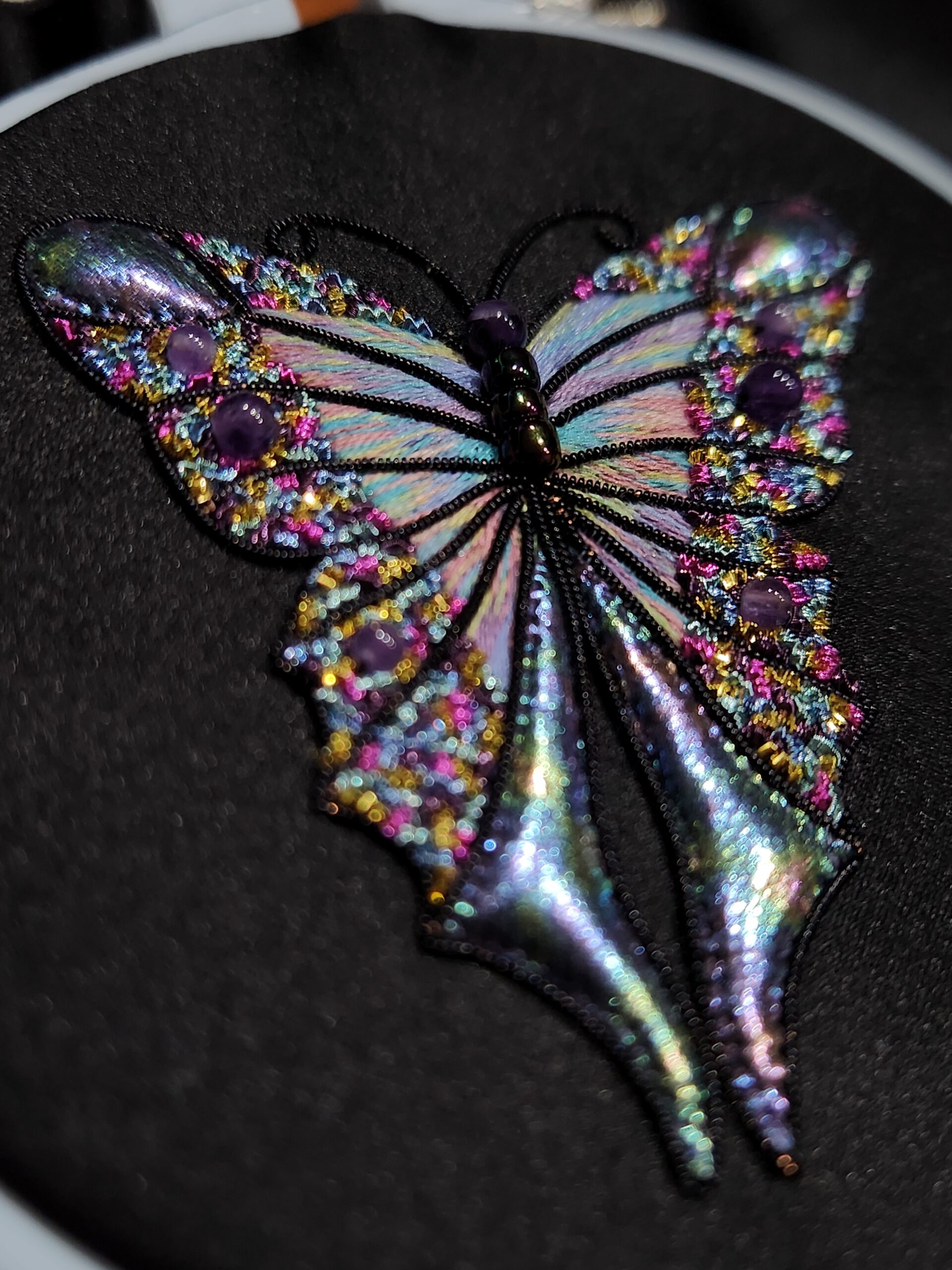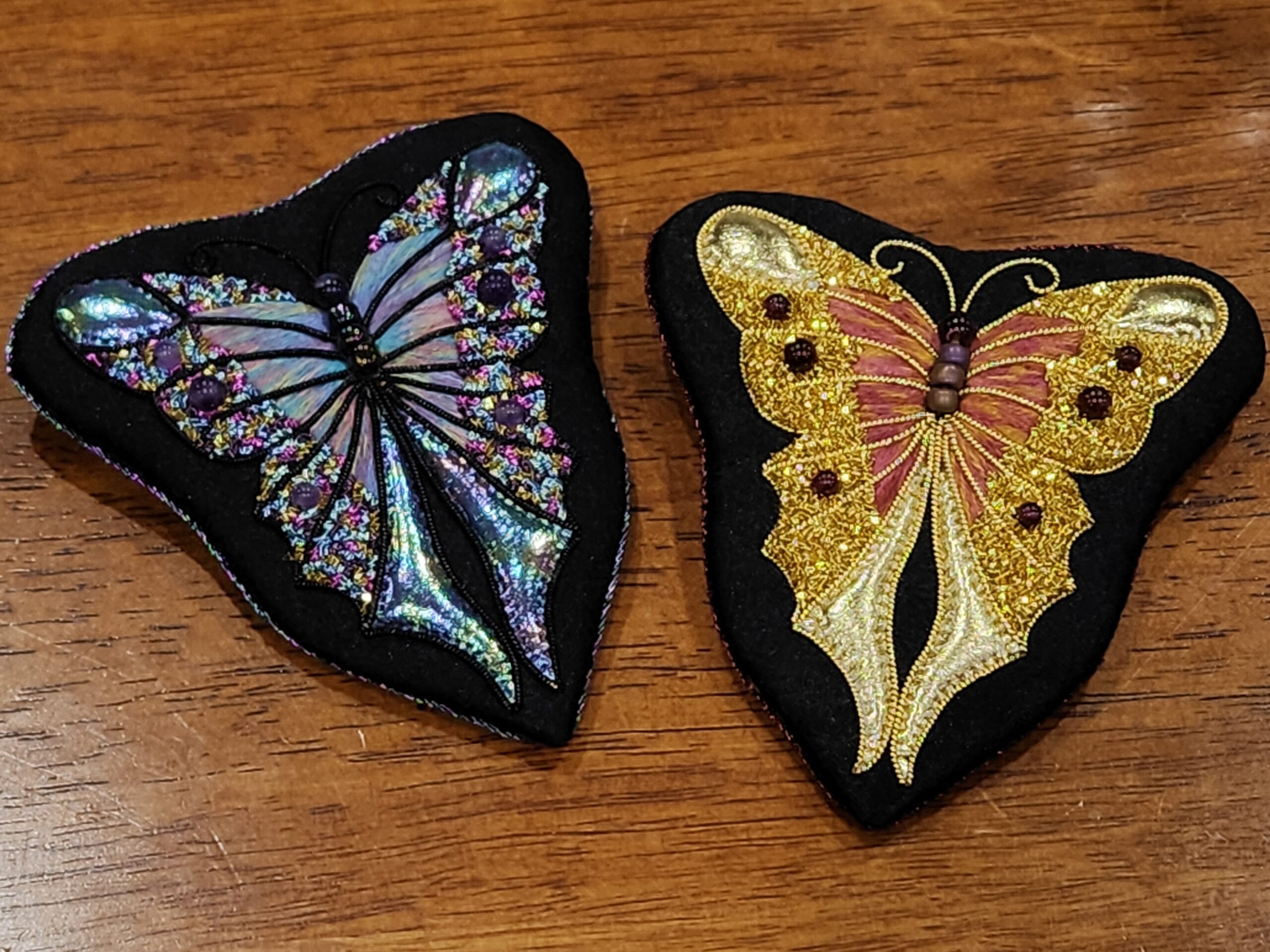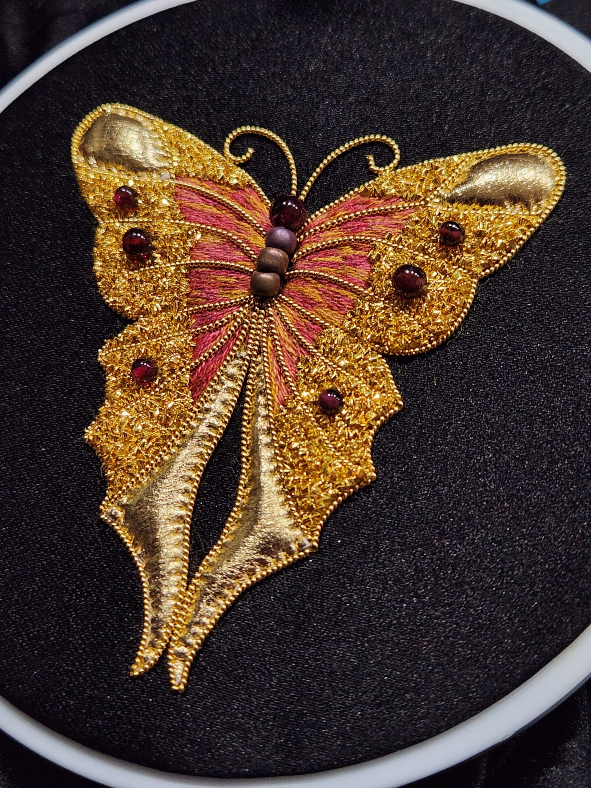 Two new brooches will be available soon! Both inspired by the Art Nouveau period, the first butterfly has a colourway inspired by stained glass windows, while the other is garnets and gold. The brooches are 7.5cm x 8cm – and if you don’t want to wear the pretties, you could frame them or mount them in a box top. The stained glass version is worked in English gilt and coloured threads along with Indian sadi, kid leather, Colourstreams silk, Mill Hill beads and amethysts. The gold version is worked in English gilt threads, kid leather, Cascade House silk, Mill Hill beads and garnets.