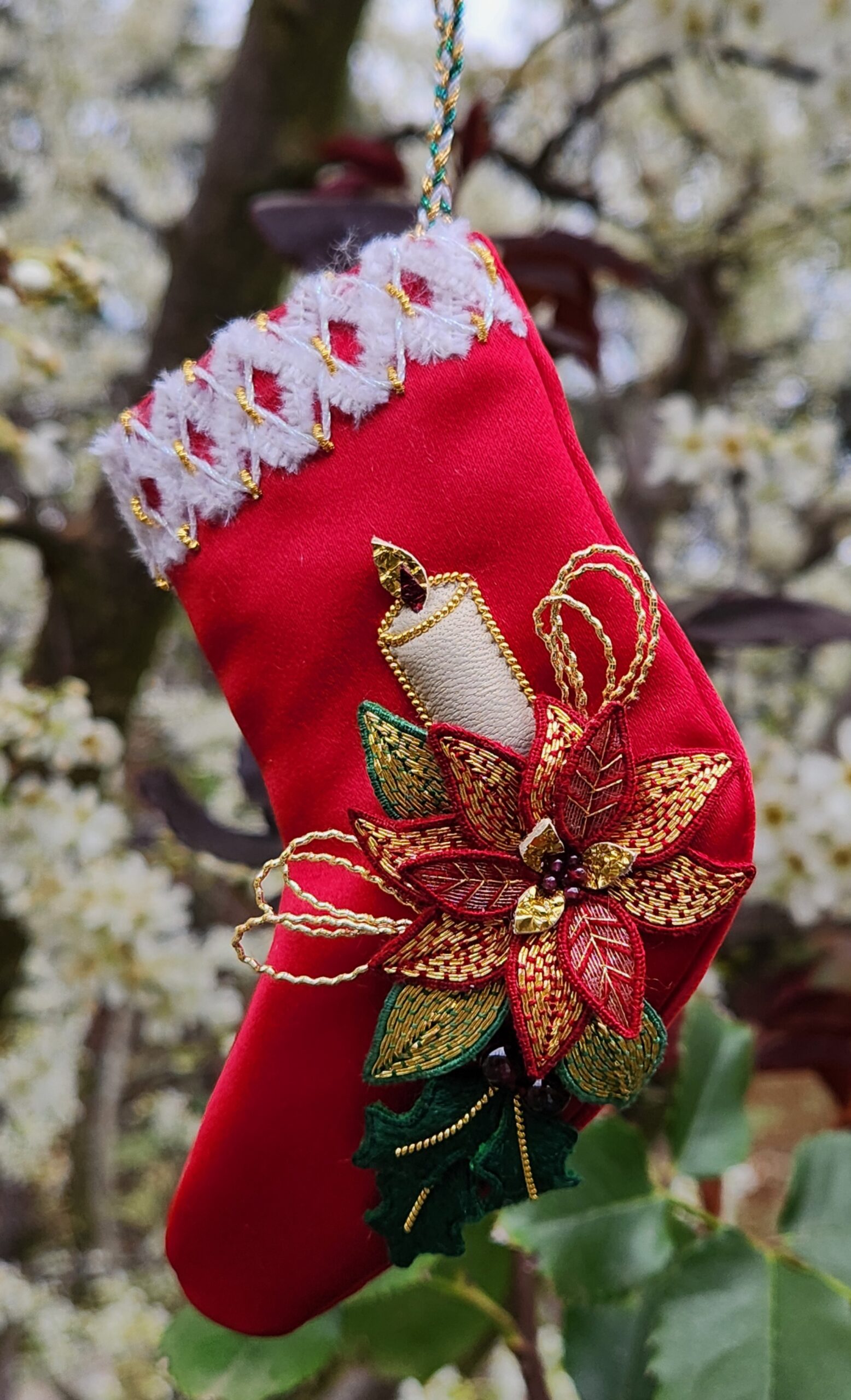 The 2025 Christmas stocking ornament features a poinsettia, holly and candle worked in Stumpwork and Goldwork techniques. It is worked in Au Ver a Soie and Gumnut Yarns silks and English gilt metal threads on red satin and is finished with garnets for the extra bit of luxury. The ornament measures 14cm from the tip of the toe to the opposite corner (where the hanger joins the ornament), and will hold small trinkets, jewellery or chocolates (mmm Lindt Lindor balls!)