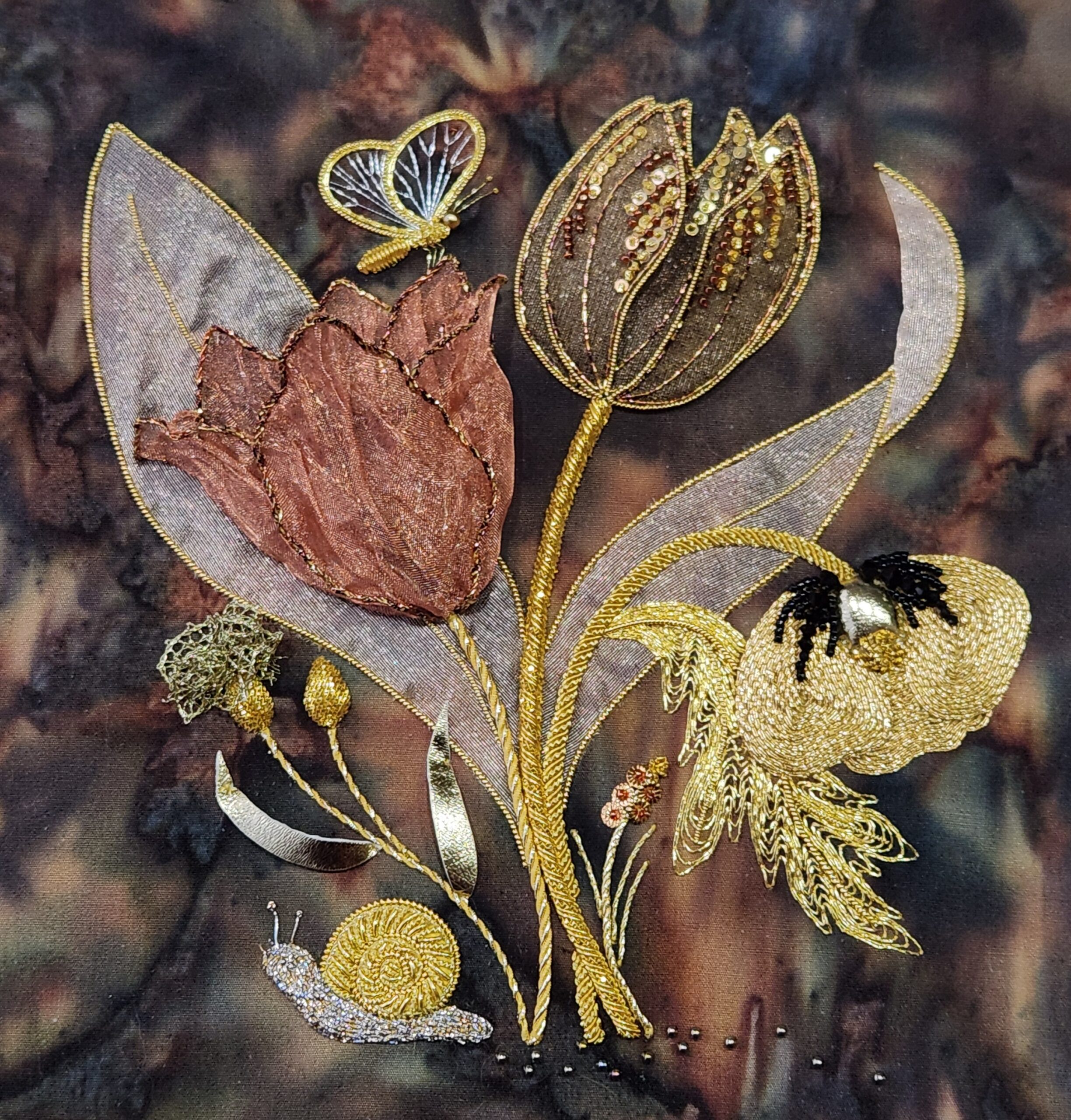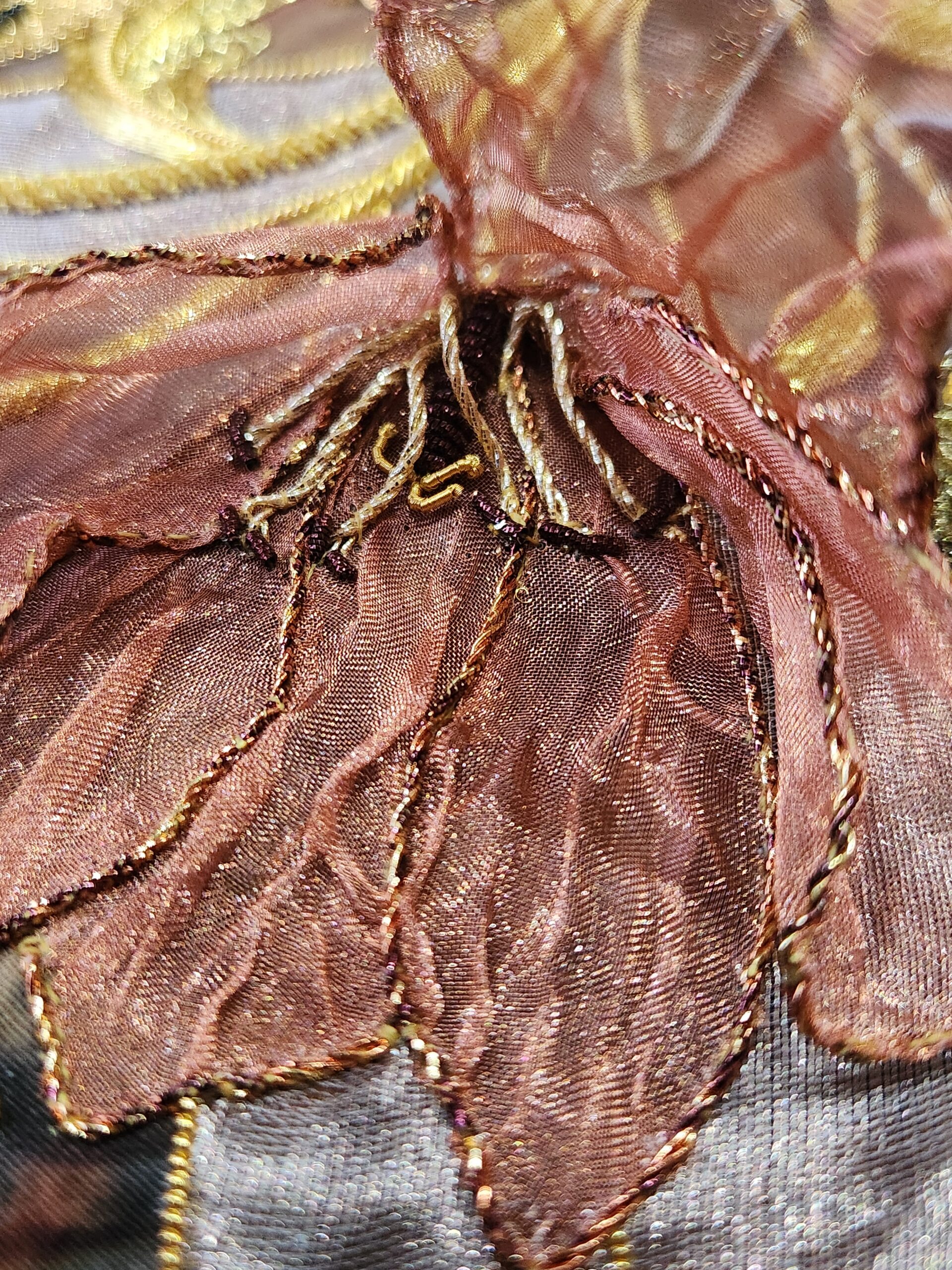 This is a design for those that like to get their teeth into a project that will take a little while to complete. Embroidered in traditional and creative metal thread techniques, it is worked in English gilt metal threads and Japanese couching threads on a cotton background. The piece has quite a lot of laid purl work in it, along with work on organza and metal mesh. This design uses a range of techniques to create the three dimensional effect and has a fully detached ‘floating’ petal to create the effect that it has just dropped off the poppy bloom.