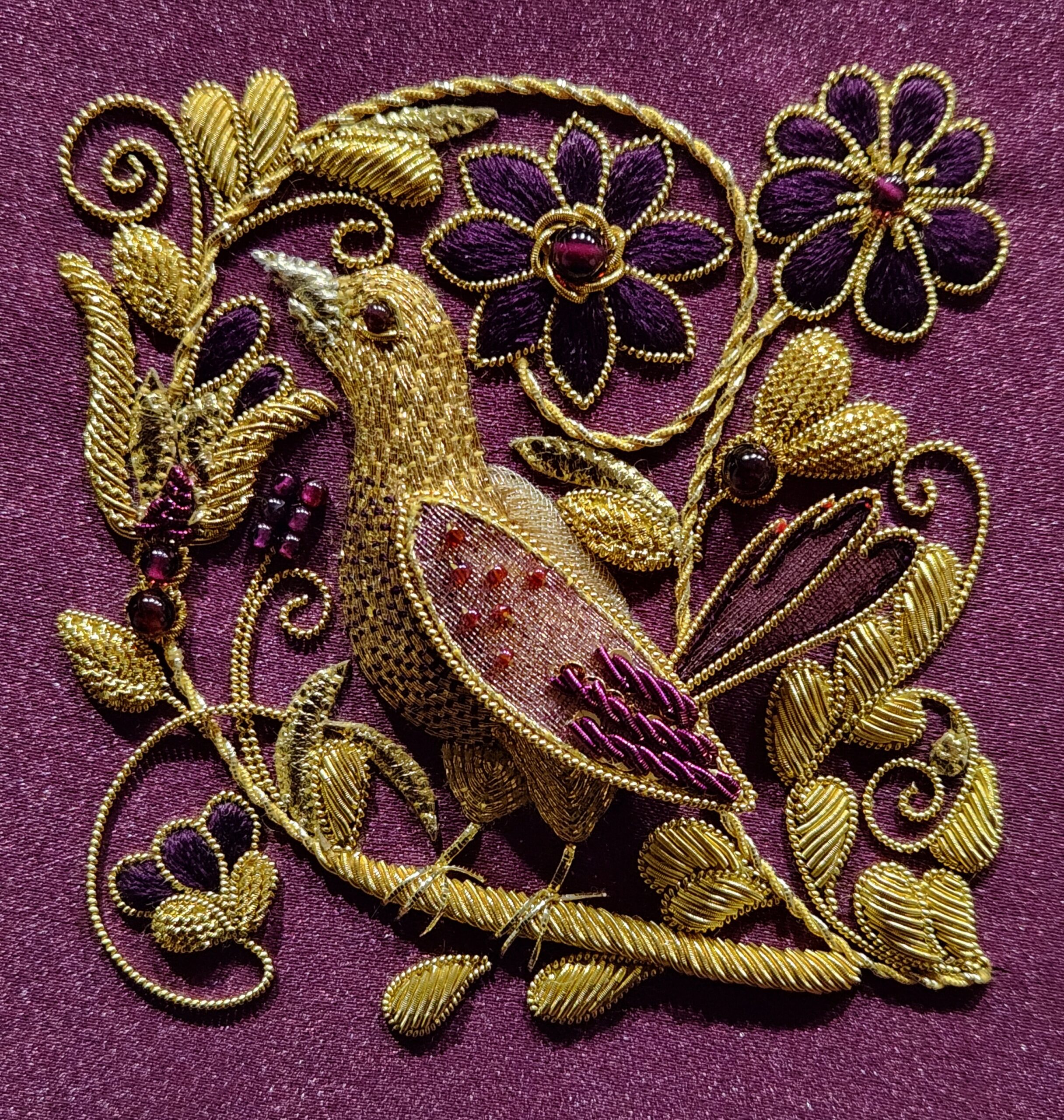 The piece is worked on berry delustered satin in Au Ver a Soie silk and English gilt metal threads with accents in garnets, Indian sadi and glass beads. This little piece only measures 8cm square and features a lot of laid work, along with brick stitch, felt and cotton padding, detached elements and and assortment of other techniques.